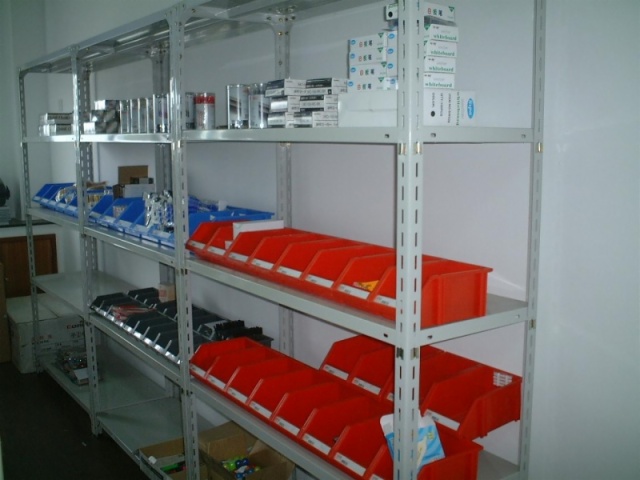 Angle steel shelves with universal angle steel column of lightweight steel shelves, installed in the connecting and inserting way, convenient installation and disassembly, steel plate to 50mm for the section of the regulation freely from, meet a variety of requirements.