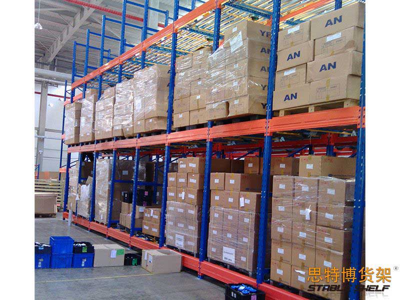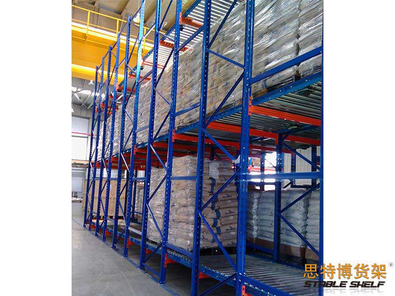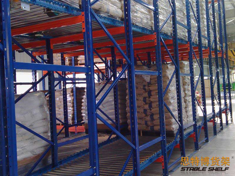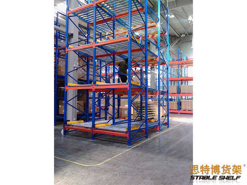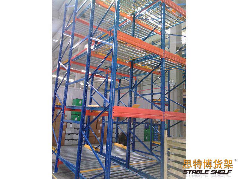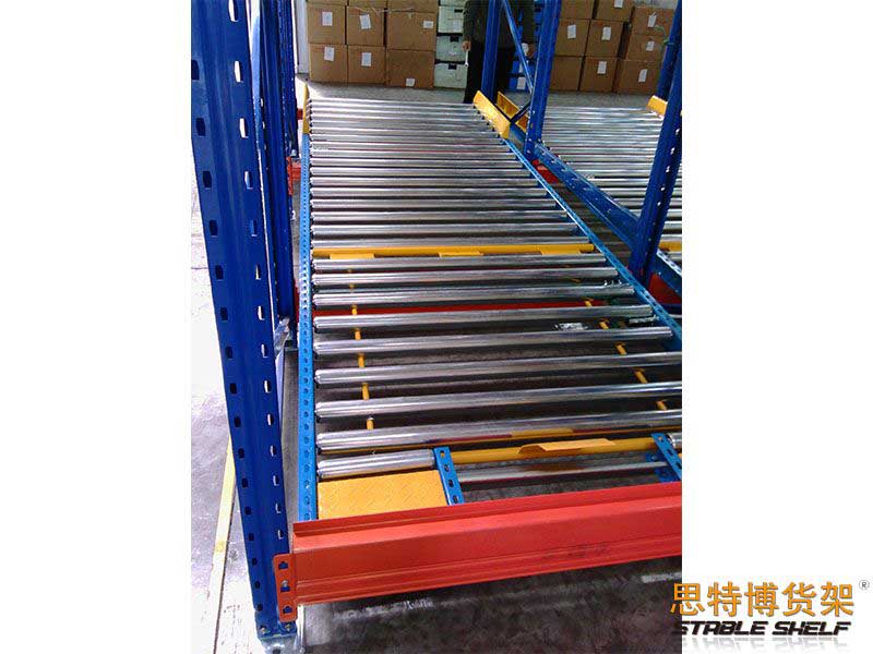 The gravity shelf is also called the roller shelf, which belongs to the pallet storage shelf in the storage shelf. The gravity shelf is one of the derivatives of the beam shelf, the shelf structure is similar to the beam shelf, but the drum track is installed on the beam, and the track is tilted 3-5°. Pallet goods are transported by forklift to the purchase port of the shelf, and the pallet automatically glides from the entrance to the pick-up port at the other end by using its own weight. The gravity shelf is a first-in-first-out storage method.