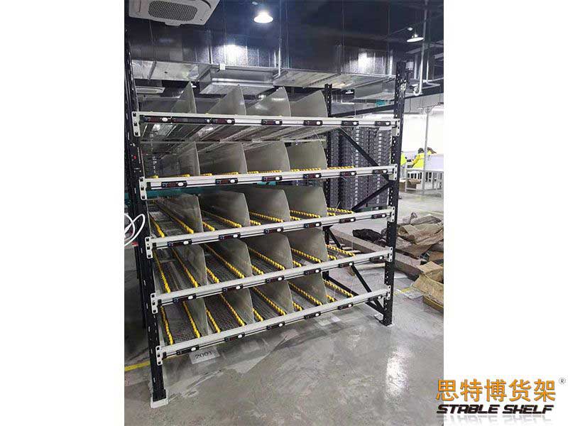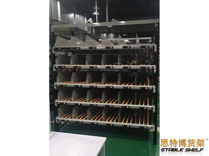 流利式貨架又稱滑移式貨架,采用輥輪鋁合金,鈑金等流利條,利用貨物臺架的自重,從一邊通道存貨,另一邊通道取貨實現(xiàn)先進(jìn)先出,存儲方便,以及一次補(bǔ)貨多次取貨。流利架存儲效率高,適合大量貨物的短期存放和揀選??膳潆娮訕?biāo)簽,實現(xiàn)貨物的輕松管理,常用滑動容器有周轉(zhuǎn)箱,零件盒及紙箱,適合大量貨物和短期存放和揀選。廣泛應(yīng)用于配送中心、裝配車間以及出貨頻率較高的倉庫。