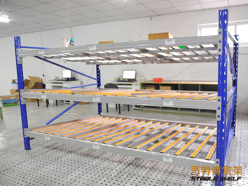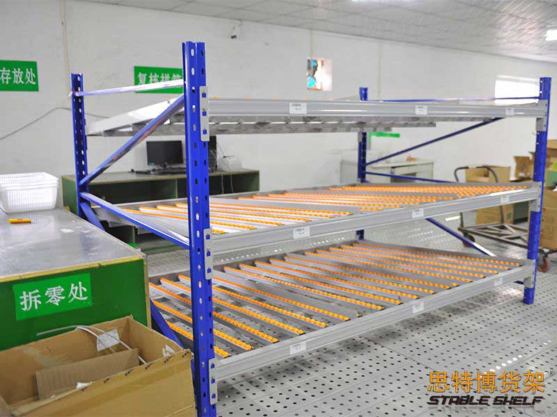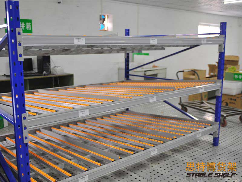 流利式貨架又稱滑移式貨架,采用輥輪鋁合金,鈑金等流利條,利用貨物臺架的自重,從一邊通道存貨,另一邊通道取貨實現(xiàn)先進先出,存儲方便,以及一次補貨多次取貨。流利架存儲效率高,適合大量貨物的短期存放和揀選??膳潆娮訕撕灒瑢崿F(xiàn)貨物的輕松管理,常用滑動容器有周轉(zhuǎn)箱,零件盒及紙箱,適合大量貨物和短期存放和揀選。廣泛應用于配送中心、裝配車間以及出貨頻率較高的倉庫。