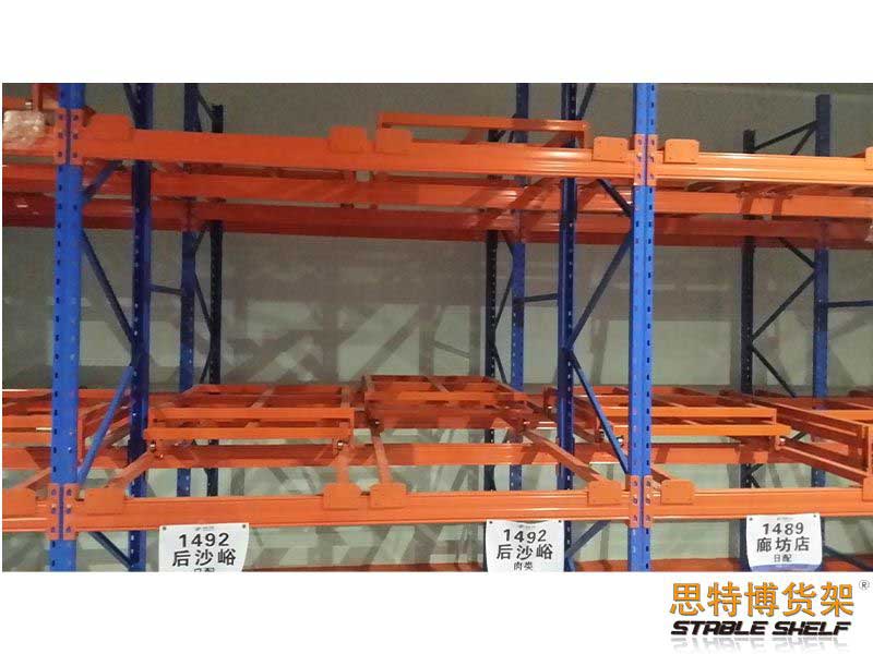 壓入式貨架又名后推式貨架——是在前后梁間以多層臺車重疊相接,從外側(cè)將疊棧貨物置于臺車推入,后儲存之貨品會將原先貨品推往里面。壓入式貨架是由托盤小車等典型結(jié)構(gòu)件組成,托盤車具有可流動特性,貨物被規(guī)定于貨架的一端進(jìn)出,并遵循先進(jìn)后出順序。儲運(yùn)貨物時叉車只位于貨架通道水平較低的一端作業(yè),無需進(jìn)入貨架貨物存儲通道。此類貨架具有存儲密度高,儲運(yùn)速度快的典型特征。通常用于存儲場地極其有限,但需要增加存儲容量或?qū)ω浳镉袝r間要求等對貨物揀選要求不高的場合使用。壓入式的優(yōu)點(diǎn)就是節(jié)約作業(yè)通道數(shù)量,對叉車要求不高,可以有效提高利用率,主要應(yīng)用在倉庫空間不足,而且倉庫的面積又不大的地方;而且貨品要符合可以先進(jìn)后出的位置。