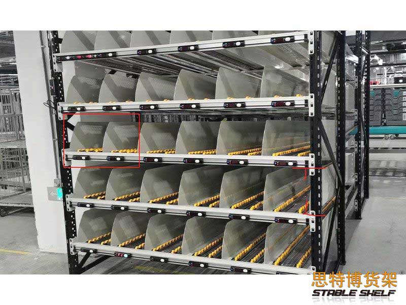 流利式貨架又稱滑移式貨架,采用輥輪鋁合金,鈑金等流利條,利用貨物臺架的自重,從一邊通道存貨,另一邊通道取貨實現(xiàn)先進(jìn)先出,存儲方便,以及一次補(bǔ)貨多次取貨。流利架存儲效率高,適合大量貨物的短期存放和揀選??膳潆娮訕?biāo)簽,實現(xiàn)貨物的輕松管理,常用滑動容器有周轉(zhuǎn)箱,零件盒及紙箱,適合大量貨物和短期存放和揀選。廣泛應(yīng)用于配送中心、裝配車間以及出貨頻率較高的倉庫。
