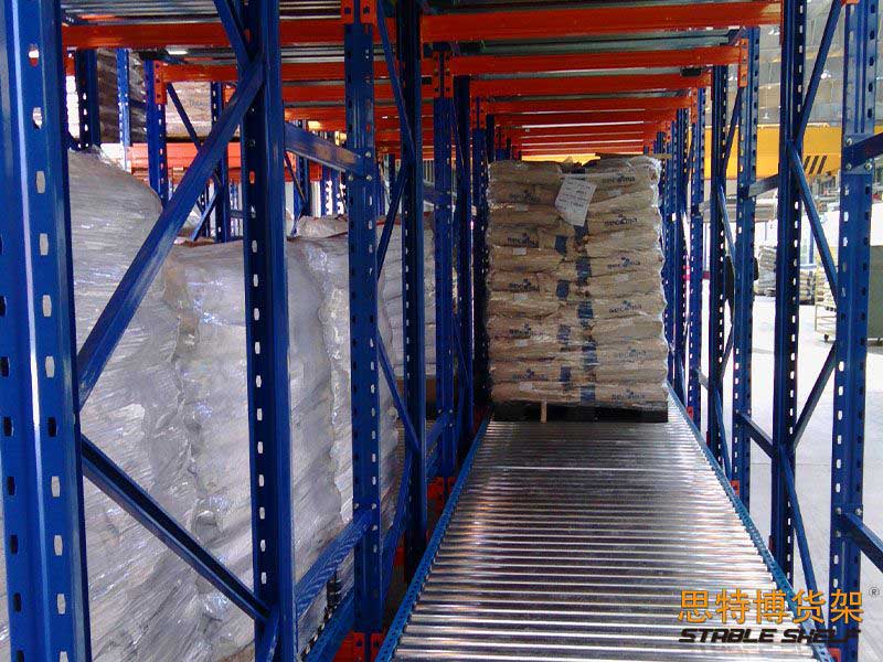 在貨架的組與組之間沒有作業(yè)通道,從而增加了60%的空間利用率,提高了倉儲的容積率;托盤操作遵循先進先出的原則;自動儲存回轉;儲存和揀選兩個動作的分開大大提高輸出量,由于是自重力使貨物滑動,而且沒有操作通道,所以減少了運輸路線和叉車的數(shù)量